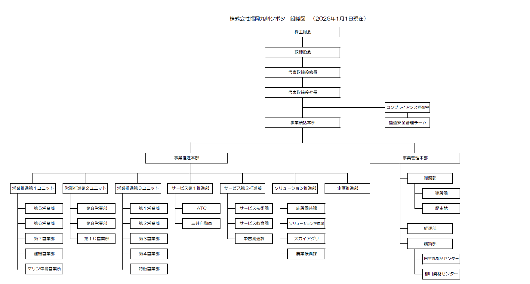 | 昭和初期 | 昭和初期農機具販売の草分け時代より株式会社クボタ(旧久保田鉄工株式会社H.2.4.より社名変更)の特約販売店であった福岡クボタ販売株式会社及び井上農機販売株式会社の2社が、株式会社クボタの資本参加を得て企業合同により、福岡クボタ農機販売株式会社を設立 |